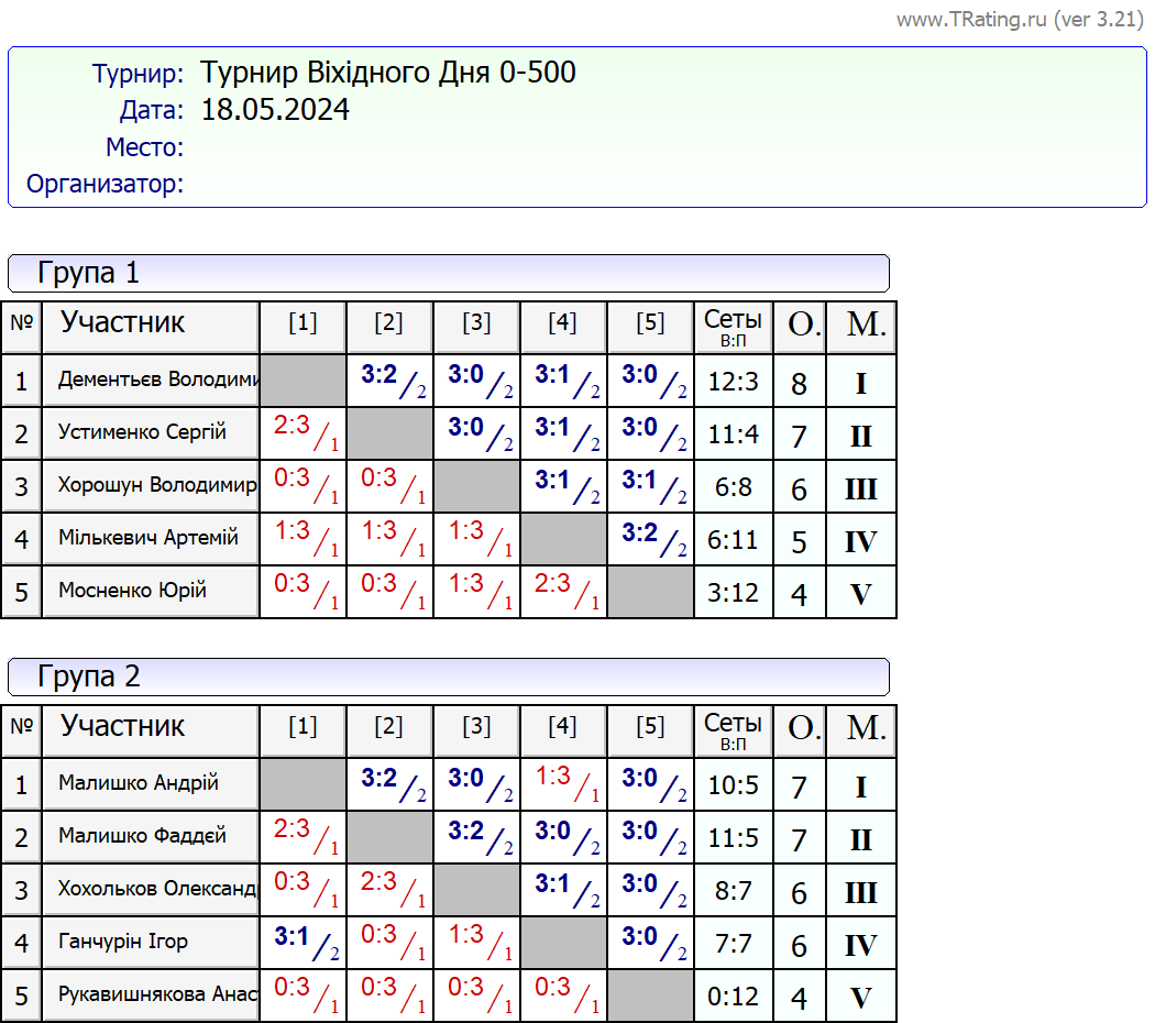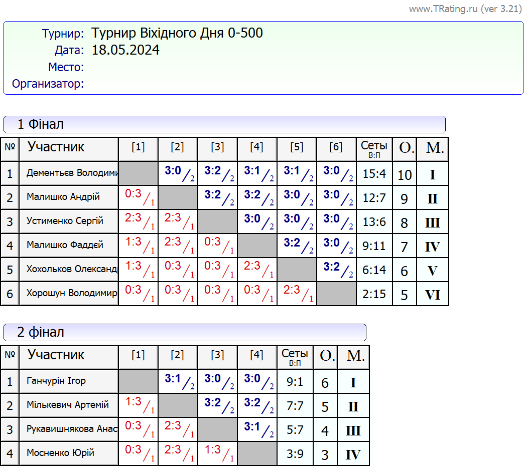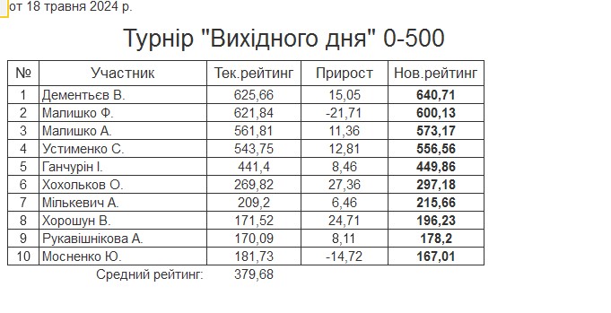 Результати турніру “Вихідного дня 0-500” за 18.05.2024