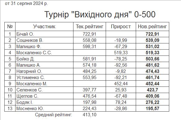 Результати турніру “Вихідного дня 0-500” за 31.08.2024