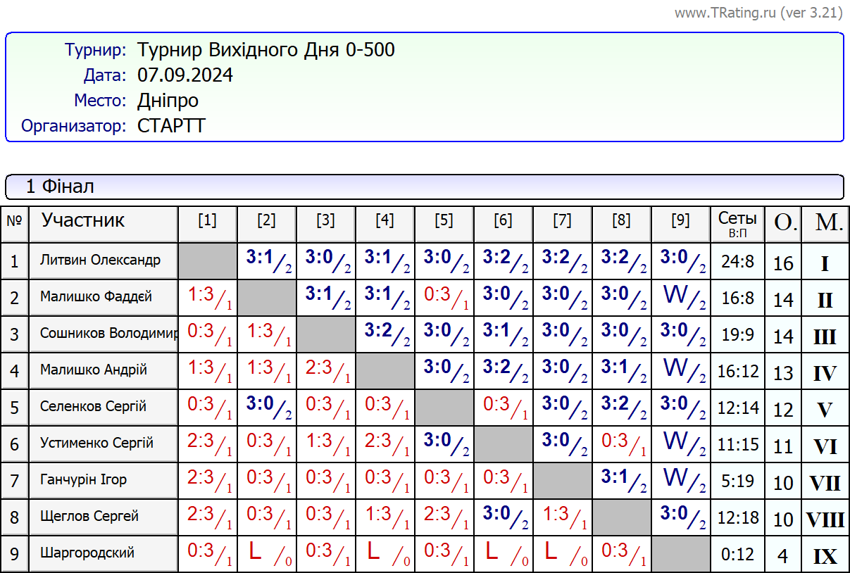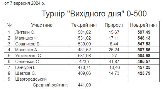Результати турніру “Вихідного дня 0-500” за 07.09.2024