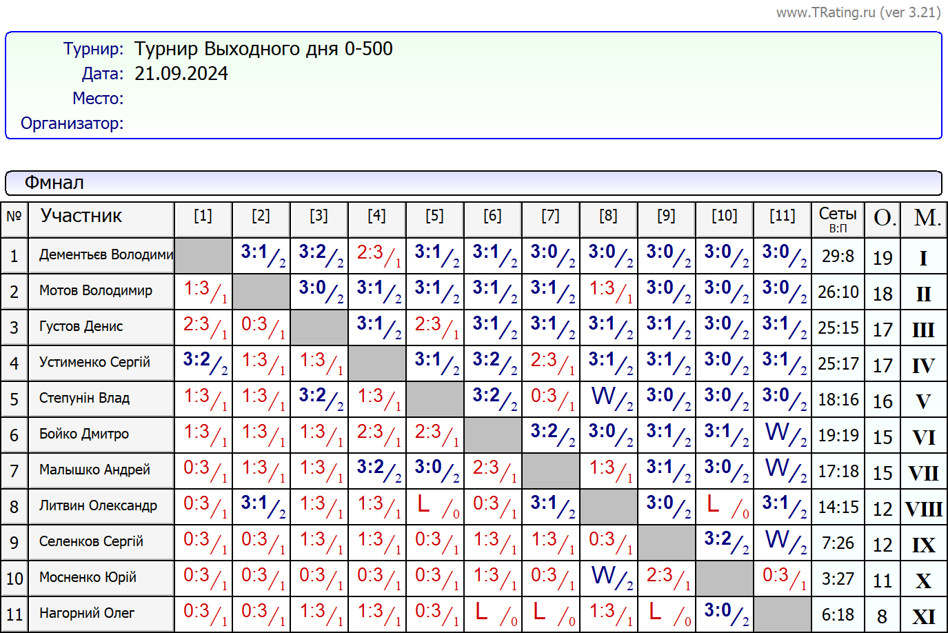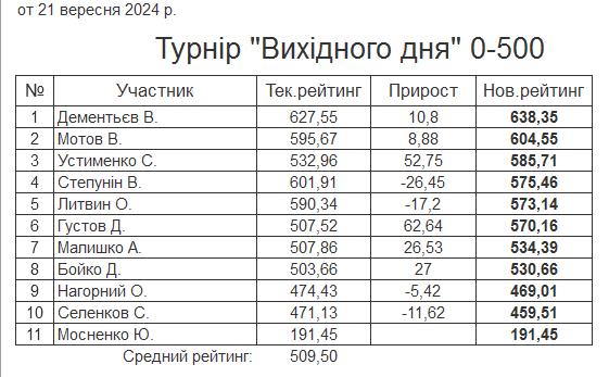 Результати турніру “Вихідного дня 0-500” за 21.09.2024