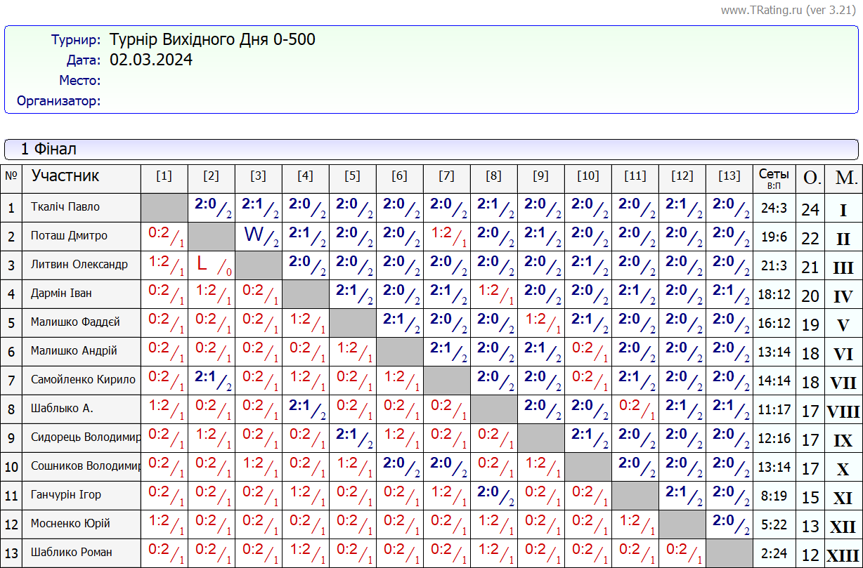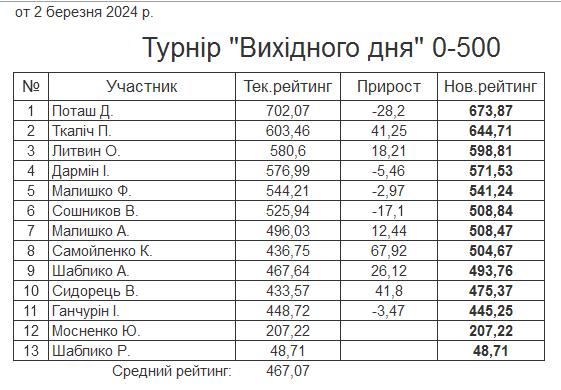 Результати турніру “Вихідного дня 0-500” за 02.03.2024
