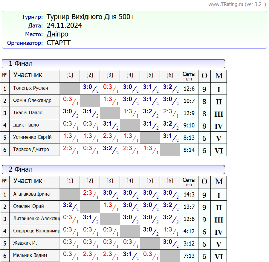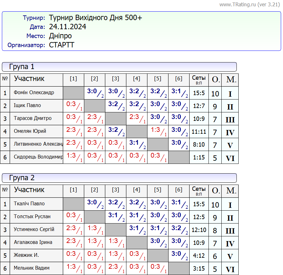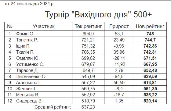 Результати турніру “Вихідного дня 500+” за 24.11.2024