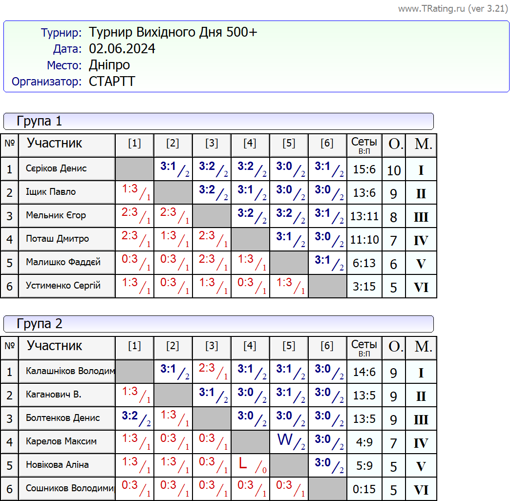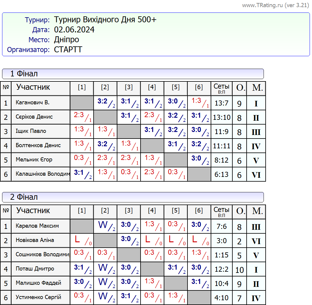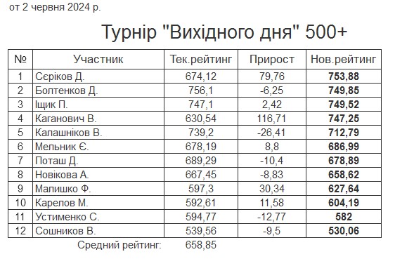 Результати турніру “Вихідного дня 500+ (Рейтинговий турнір)” за 2.06.2024
