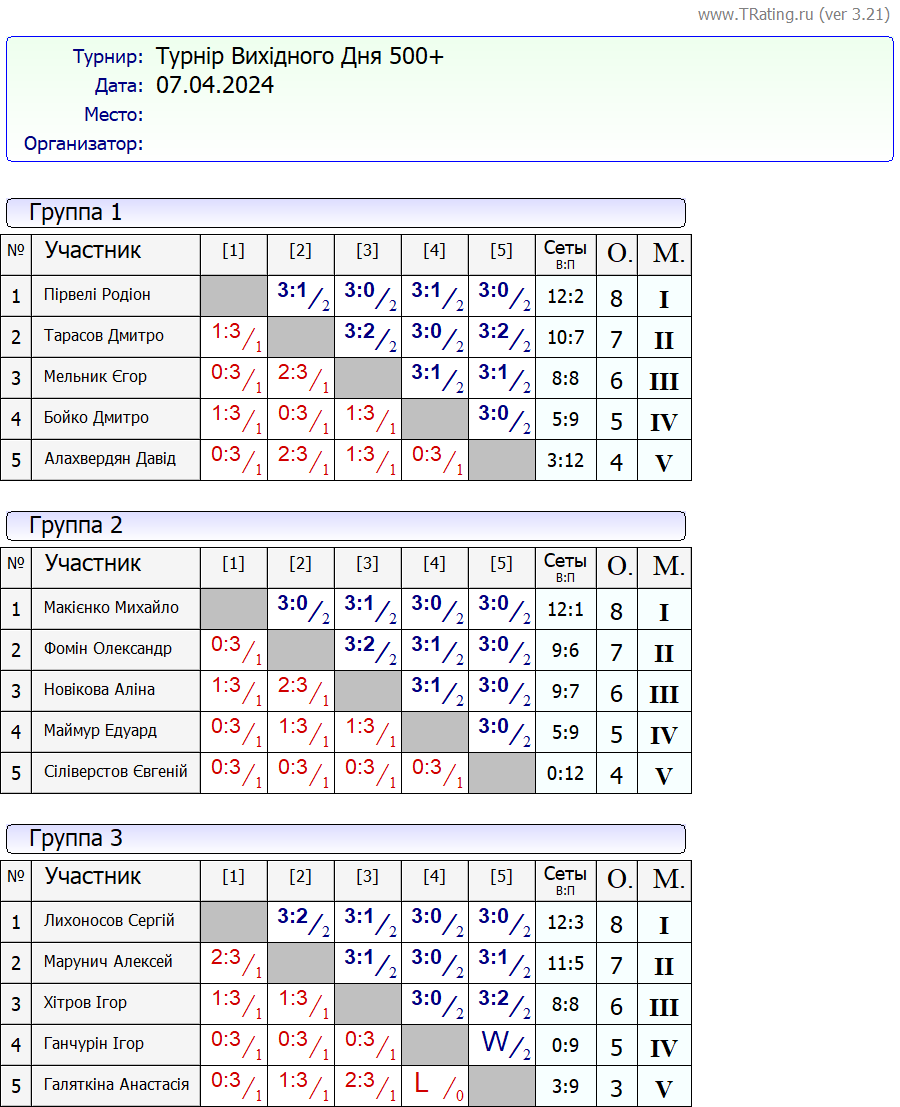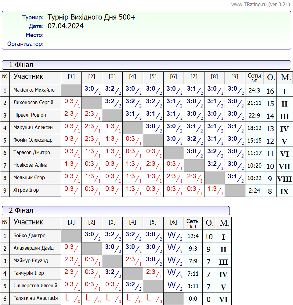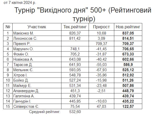 Результати турніру “Вихідного дня 500+ (Рейтинговий турнір)” за 07.04.2024