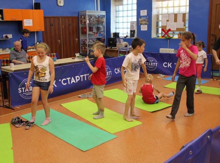 Діти займаються на 5-ти професійних столах. Зал оснащений бортиками для поділу зон і майданчиків. Відмінне освітлення при якому добре видно м’яч. За межами ігрового майданчика є зона для відпочинку.