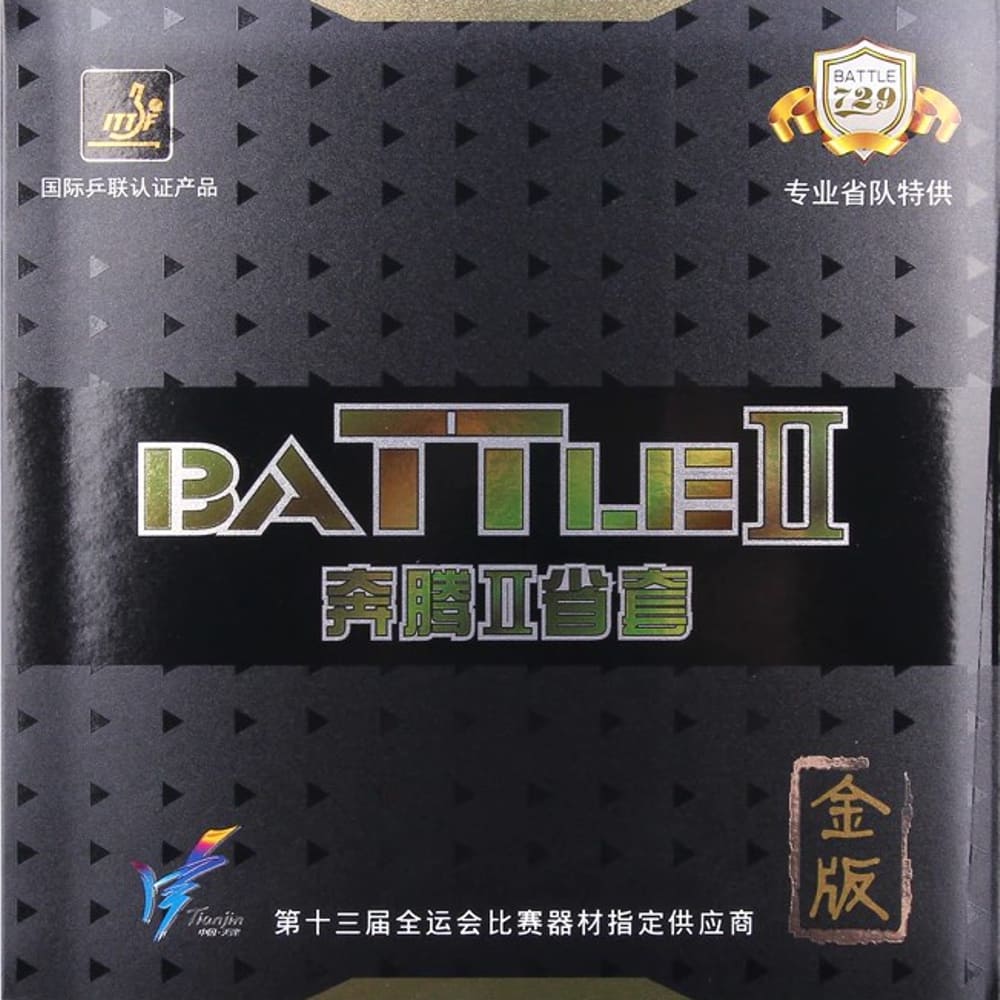 Накладка 729 Battle II Golden – золота версія накладки, яка має найбільшу липкість та еластичність топшита із серії Battle і важить 63 грами, що значно легше за інші накладки. Видає потужні обертання з чудовою високою дугою та контролем з показниками вище середнього. Щоб отримати бажаний результат, потрібно докласти деяких зусиль, тобто форсування, щоб накладка вистрілила так, як ви хочете, через свої особливості. Стане чудовим вибором для більш досвідчених гравців та професіоналів.