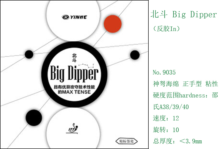 Yinhe Big Dipper – це гладка накладка, яка за своїми характеристиками відноситься до класу гібридних накладок і поєднує в собі всі кращі властивості європейських тензорів і китайських липучок. За грою схожа на провінційну версію Hurricane 3, але трохи швидше за рахунок більш м’якої і пружної губки. Губка підкладки пройшла заводську обробку і на неї нанесено шар клею. Чорні накладки йдуть на синій губці, червоні – на помаранчевій. Дуже чіпкий топшит, хороший блок, прекрасні топспіни, контрольна коротка і пасивна гра, комфорт на прийомі подач – це все про Big Dipper. Накладку можна порадити для гравців, яким подобаються липучки, але при цьому потрібна більш динамічна “європейська” губка.