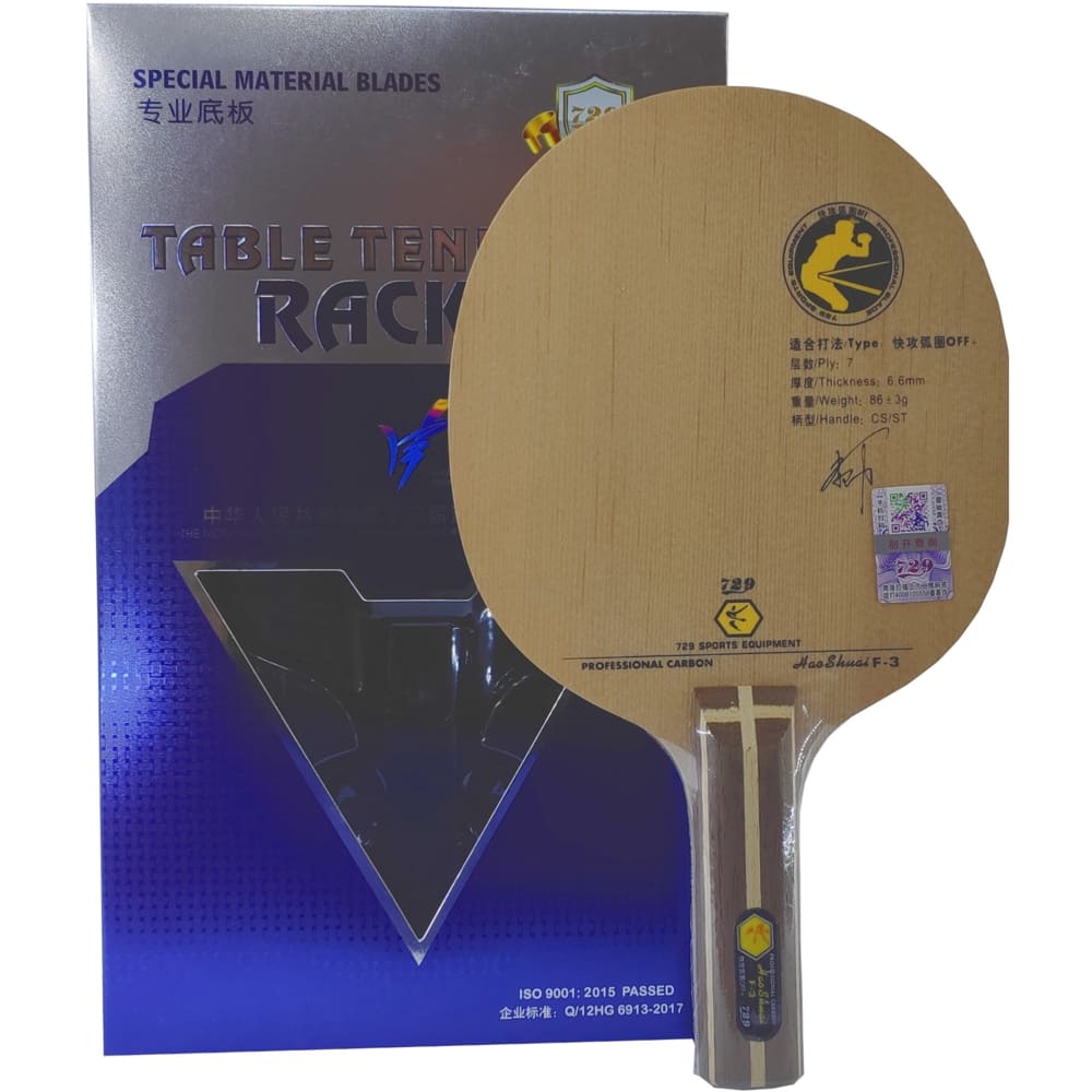 Основа 729 F-3 рекомендована для гравців з сильною, швидкою та рішучою атакою. Важить 90 грам та має зручну ST рукоятку. Складається з семи шарів: 5 з дерева та 2 з професійного карбону, який розташований близько до поверхні, що трохи знижує показники контролю, але при цьому значно підвищується швидкість. Має дзвінкий відскік, практично без вібрації. Ця основа дозволить вам дуже швидко атакувати, створюючи тиск на противника та не залишаючи йому шансів.
