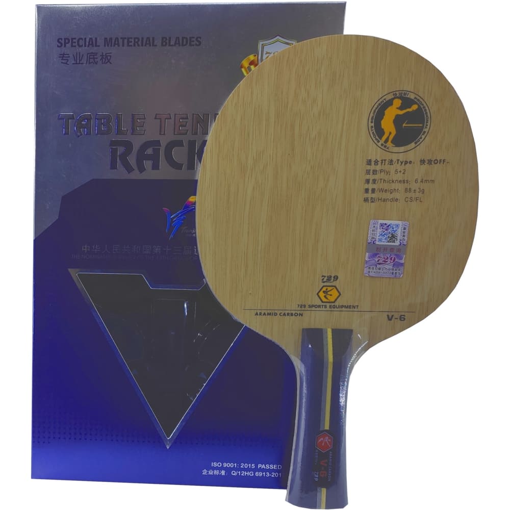 Основа 729 V-6 рекомендована як для атаки, так і для захисту. Володіє відмінними ігровими властивостями, які зазвичай характерні для більш дорогих основ. У конструкції 729 V-6 використані п’ять шарів спеціально підібраної деревини та два шари Aramid Carbon. Таке поєднання професійних компонентів дає можливість потужно, динамічно і нищівно атакувати та впевнено захищатися. Ця основа забеспечує особливе м’яке відчуття м’яча, яке знижує кількість помилок у короткій грі, дуже високий контроль; стабільність та незвичайно велику пляму відскоку. Висока чутливість та невелика вібрація полегшують прийом подач та будь-яку іншу коротку гру, допомогаючи впоратися з чужими обертаннями. Слід зазначити хорошу сполучуваність з багатьма гладкими накладками. Має вагу 90 грам з товщиною в 6,4 мм, що у порівнянні з іншими основами з такими ж компонентами, 729 V-6 досить легка. Оснащена зручною FL рукояткою. Відмінне співвідношення ціна/якість, саме тому 729 V-6 користується великою популярністю серед тенісистів
