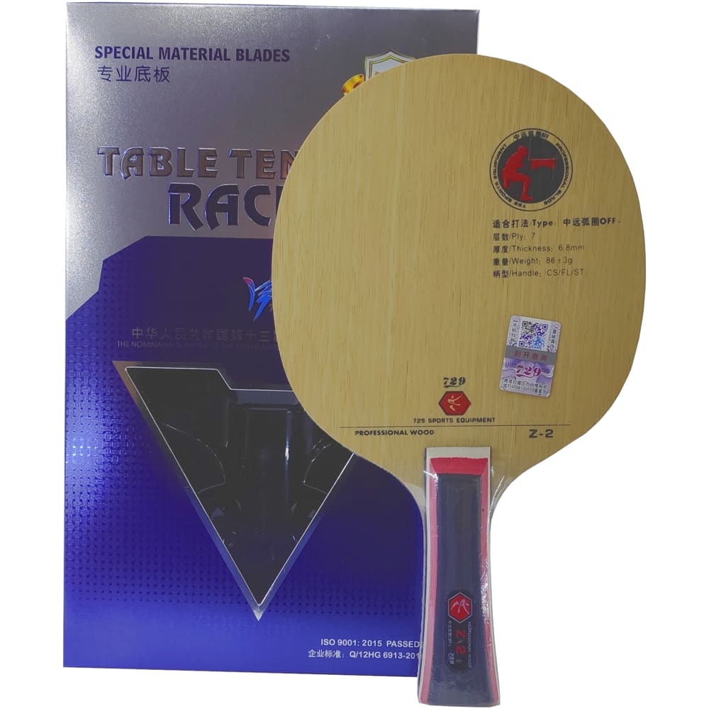 Основа 729 Z-2 рекомендована для атакуючої гри в ближній та середній зонах. Дуже вдала семишарова основа з двома шарами софт карбону – 7 (5+2 3K-c), які розташовані близько до поверхні, створюючи додаткову жорсткість для прожимання жорстких губок. Основа розроблена таким чином, щоб посилити атаку на потужних ударах та погасити вібрації, знизити вагу та забеспечити хороше відчуття м’яча. Завдяки цьому 729 Z-2 має велику стабільну пляму відскоку та відмінний контроль; важить 92 грама; має товщину 6,8 мм; володіє достатньо дзвінким відскоком. На цю основу добре встануть будь-які види накладок, крім найм’якших.